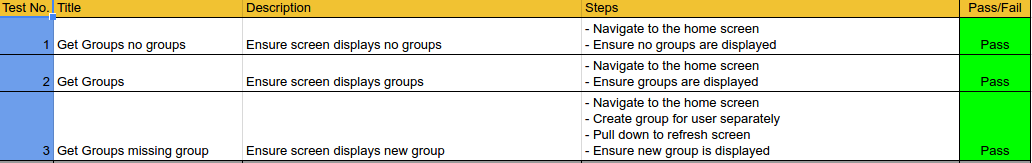 Users can now create a group, add members to groups and have all of their groups displayed in a list view on their main screen. Group members can change the name of the group and the group admin is able to remove members from the group. There are functional tests implemented to test this functionality, an example of some of the tests documented are shown in figure 1. This functionality will also be put through some more UAT from users of the system to ensure the functionality is up to standard and to get any feedback necessary.
